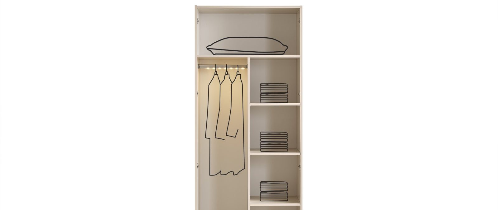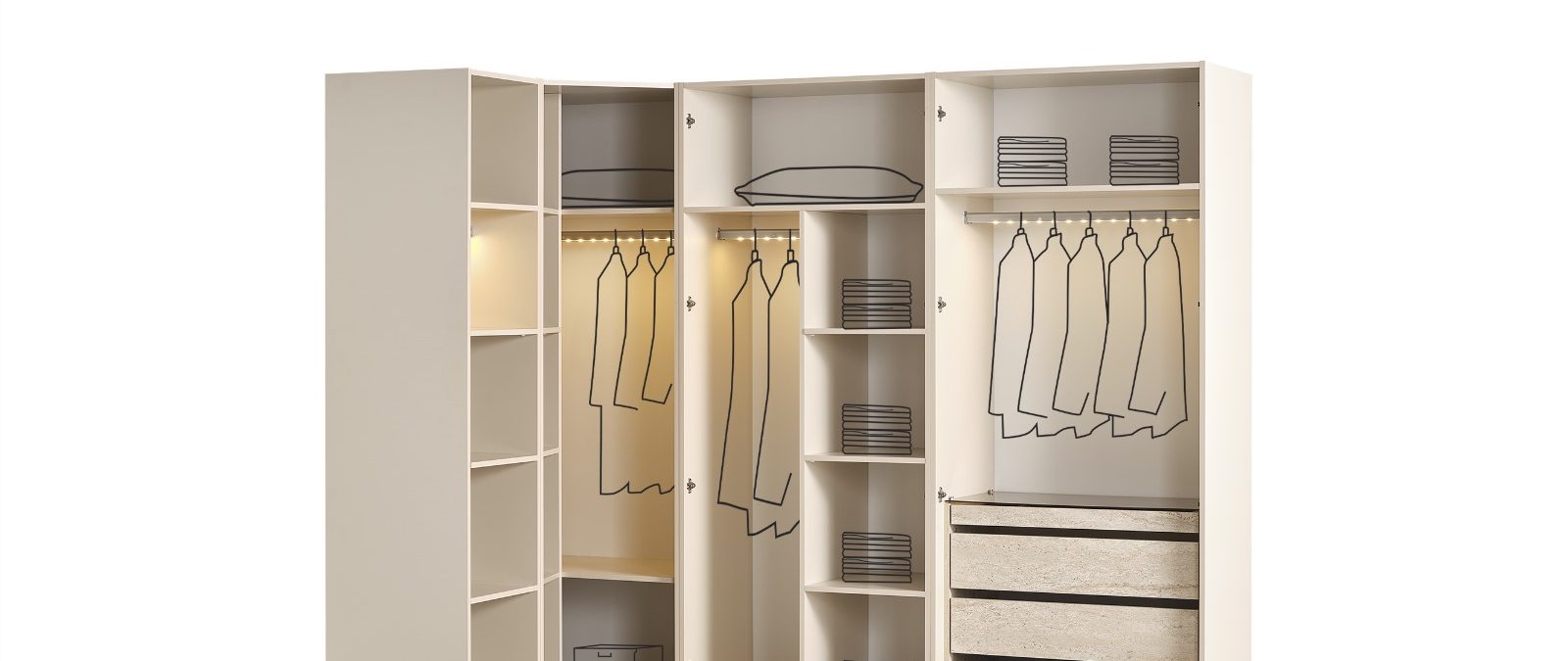 | Set; Tek Kapılı Dolap, 2A Çekmeceli Dolap, 2B Dolap ve Köşe Dolaptan Oluşmaktadır.